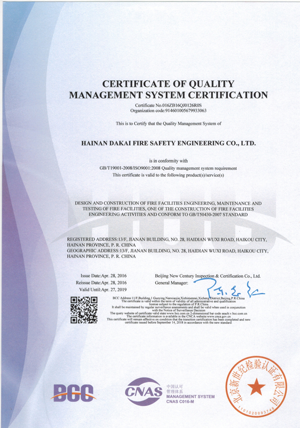 大凱消防順利獲得質(zhì)量管理體系認(rèn)證證書(shū)