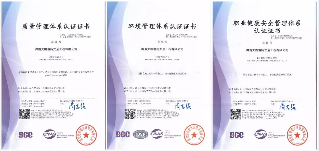 經(jīng)新世紀(jì)檢驗(yàn)股份有限公司對(duì)海南大凱消防安全工程有限公司質(zhì)量、環(huán)境、職業(yè)健康安全管理三體系運(yùn)行現(xiàn)狀深入細(xì)致的審核和總結(jié),專家組一致認(rèn)定大凱消防“三體系”運(yùn)行狀況良好,符合體系復(fù)審要求,給予順利通過(guò)。