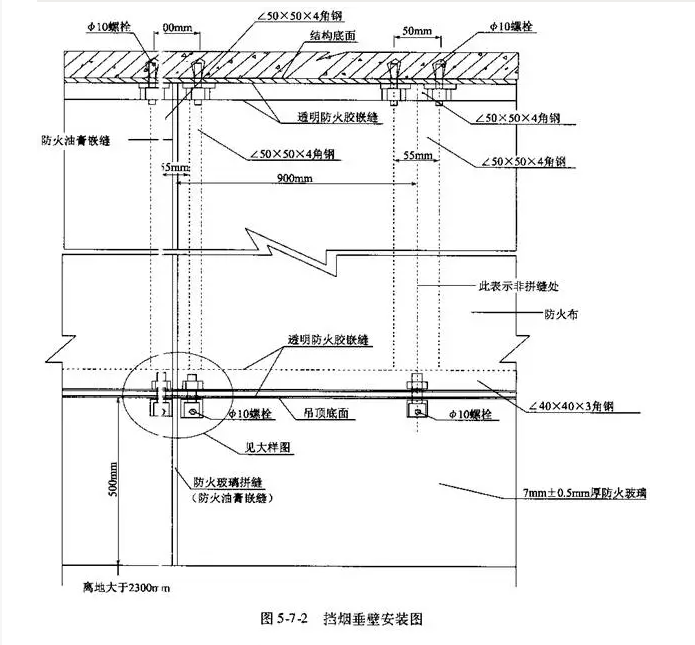 注意:擋煙垂壁每檔連接處留有的5mm間隙,用透明防火膠粘接,并保證防火玻璃遇高溫時有膨脹的空間。安裝下了前應(yīng)進(jìn)行現(xiàn)場實地測量,保證下料尺寸合理、準(zhǔn)確,均勻分段,夾絲玻璃吊裝孔的不為分布也要合理,玻璃上部不銹鋼裝飾條應(yīng)有一定強(qiáng)度,不能太軟,兩塊夾絲玻璃板連接處下部應(yīng)采用不銹鋼卡子卡牢??ㄗ舆€可固定、校正兩塊玻璃板在一條直線上。增加擋煙垂壁的美觀程度。